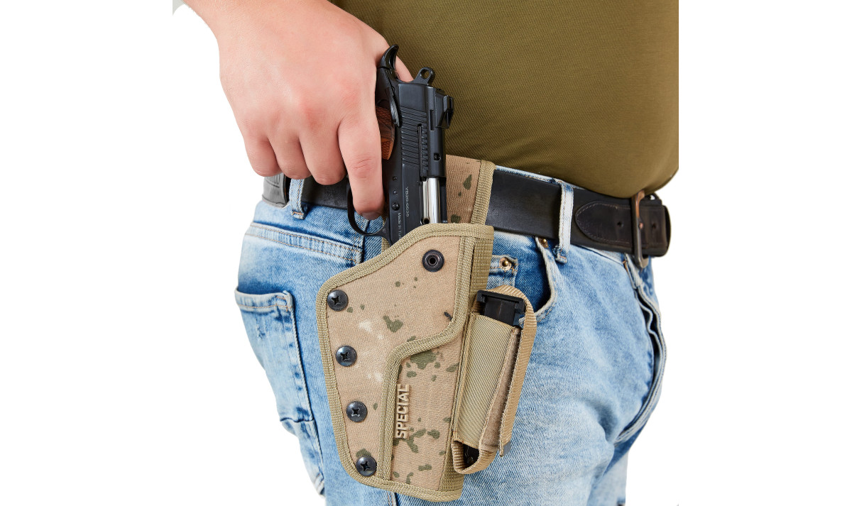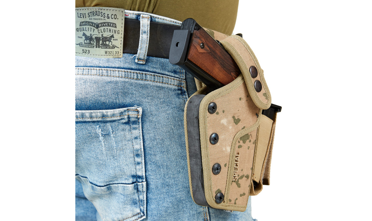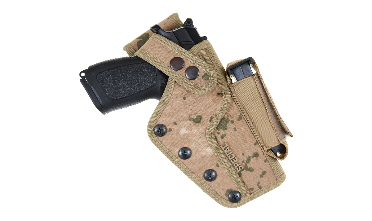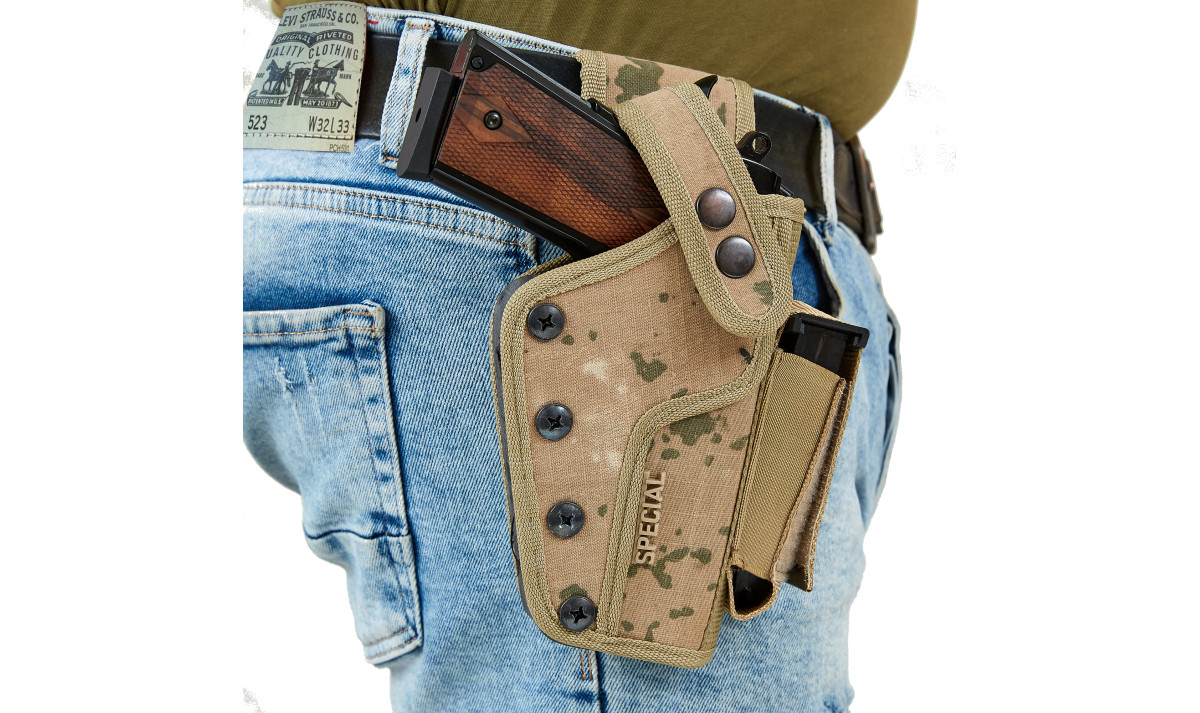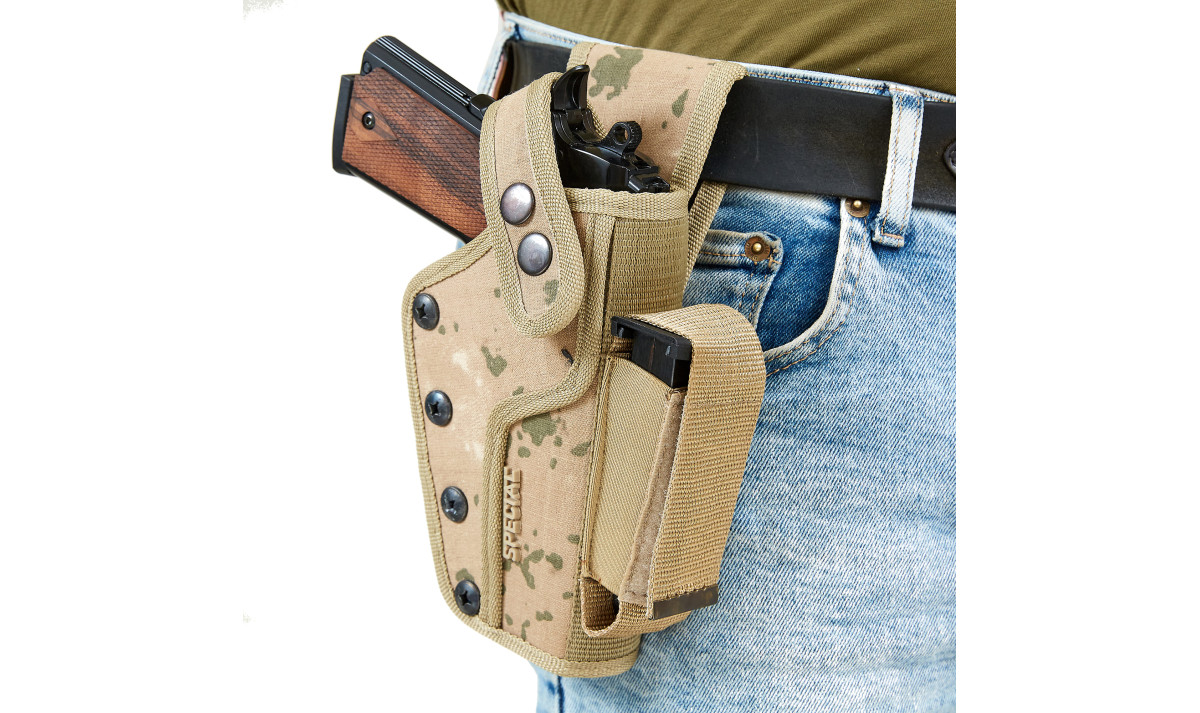 Данная кобура с дополнительным магазином подходит для больших боевых пистолетов, а также СХП и охолощенное оружие.